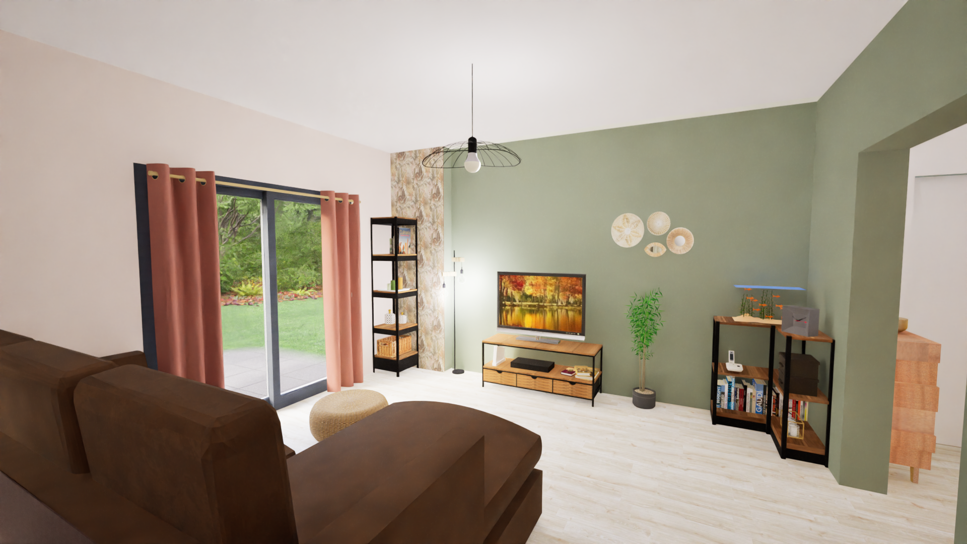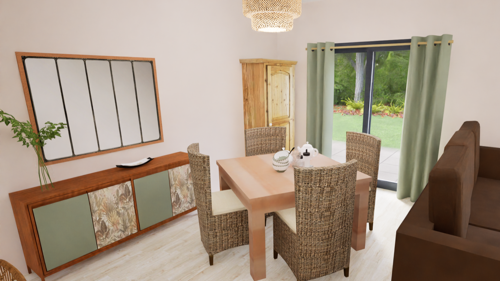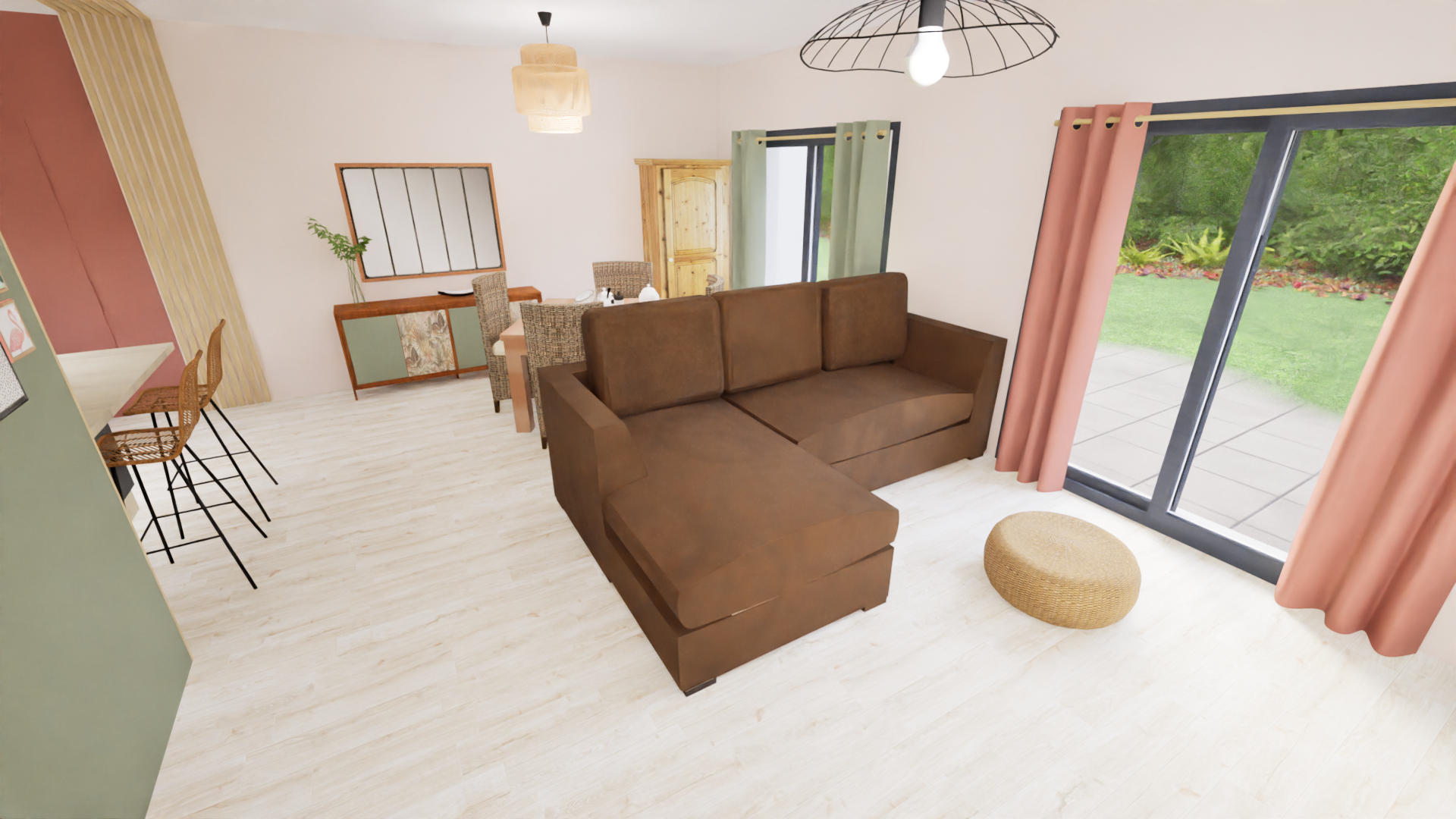 À partir des plans fournis, j’ai réalisé des modélisations 3D de chaque pièce concernée en y intégrant les meubles existants. Nous avons testé plusieurs configurations d’implantation pour s’assurer que les circulations restent fluides et que chaque meuble trouve sa place. J’ai ensuite présenté plusieurs ambiances visuelles (planches d’inspiration + nuanciers matériaux) pour aider les clients à choisir sols, revêtements et finitions.