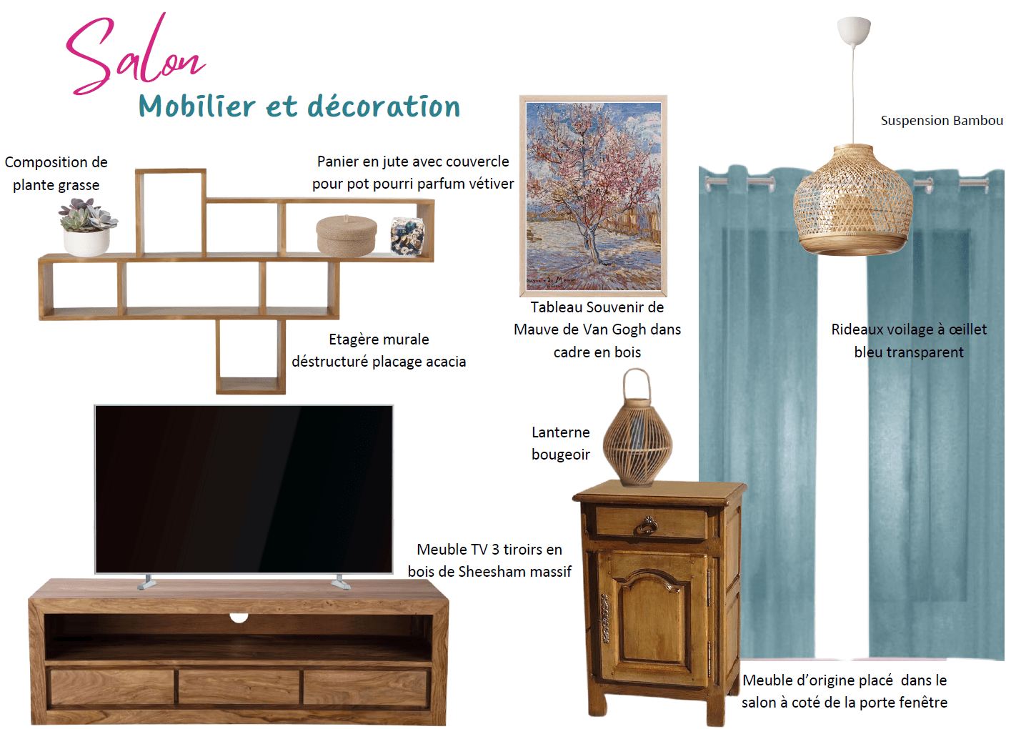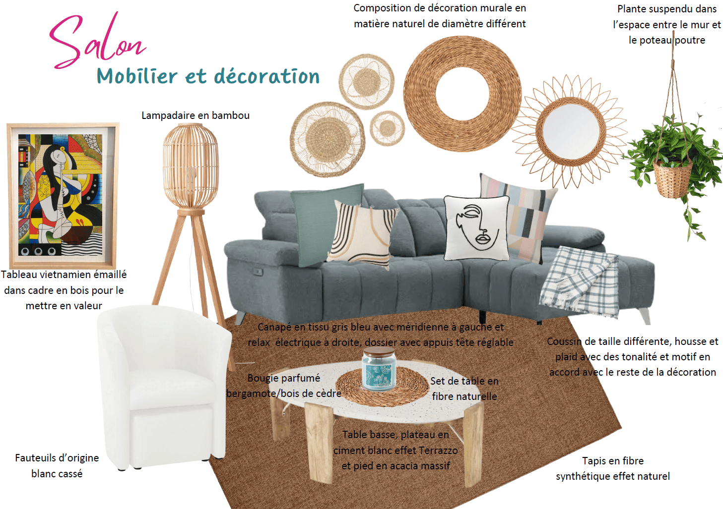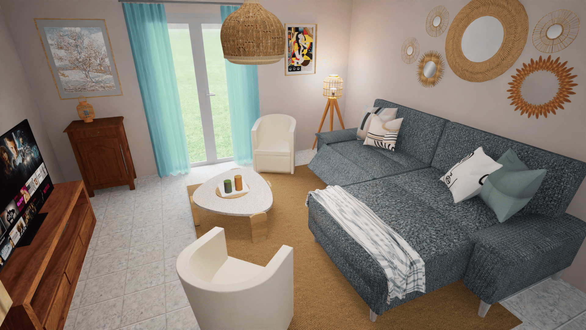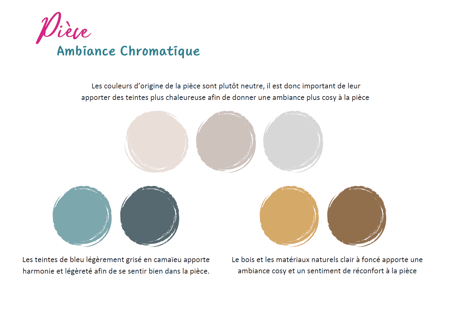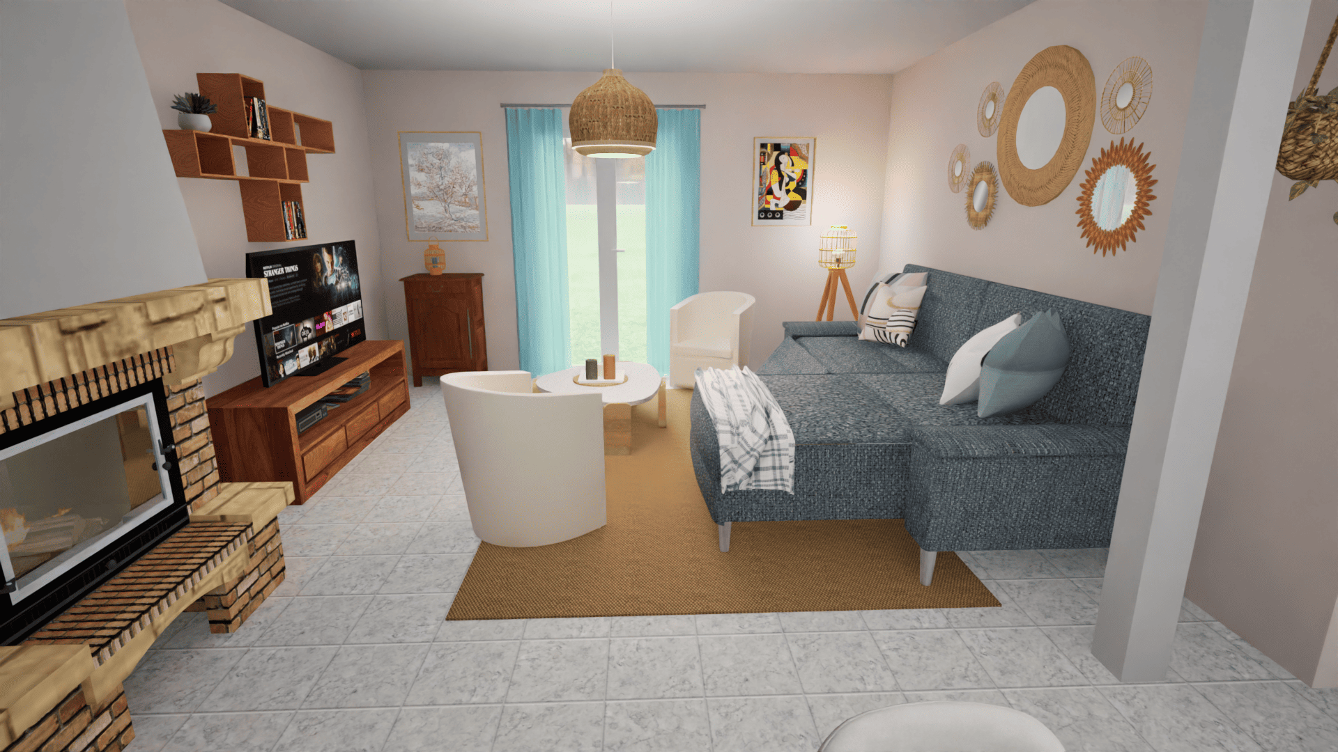 Lors de notre rencontre, nous avons défini ensemble les envies et besoins du client. J’ai ensuite travaillé une palette de bleus légèrement grisés, déclinés en camaïeu pour créer une atmosphère douce et équilibrée. J’y ai associé des matériaux naturels, principalement le bois, afin d’apporter chaleur, authenticité et confort. Enfin, j’ai présenté les visuels et suggestions de décoration pour que le client puisse se projeter facilement dans son futur salon.