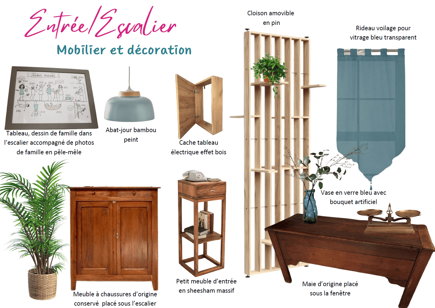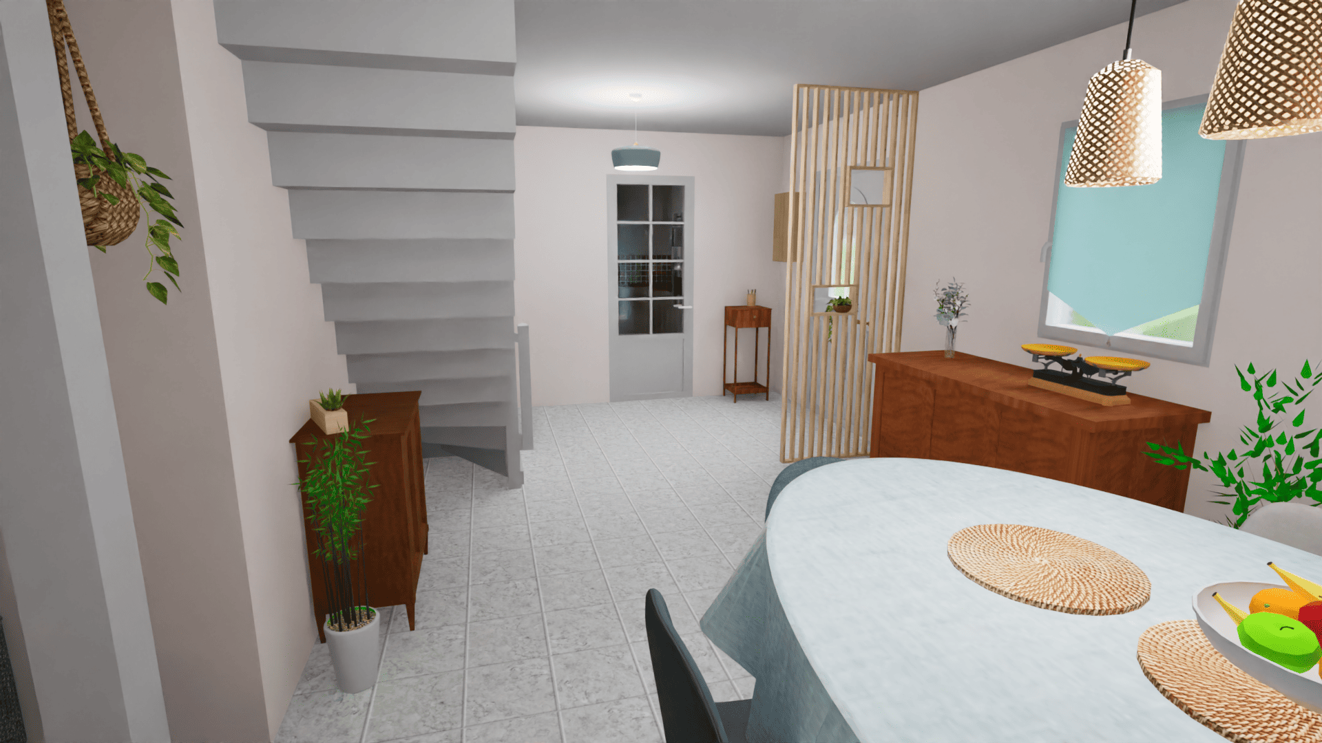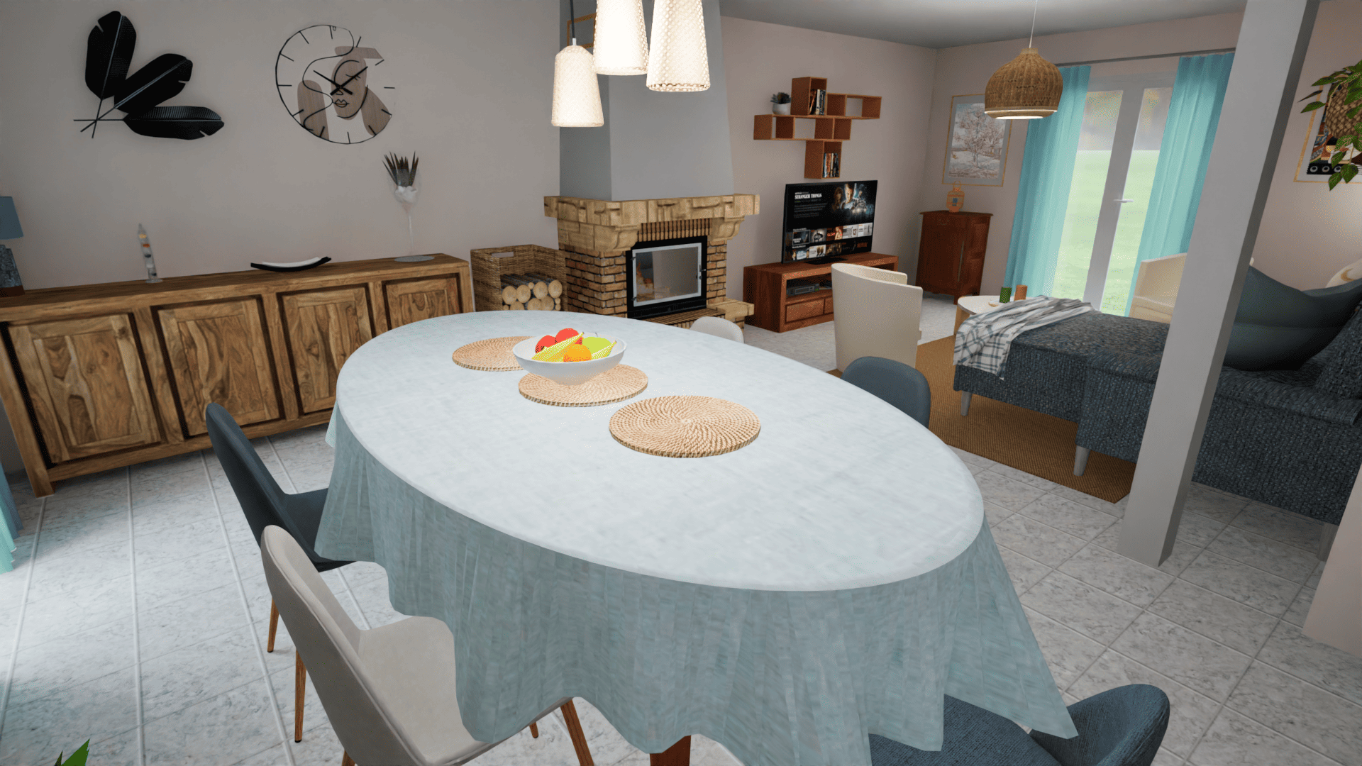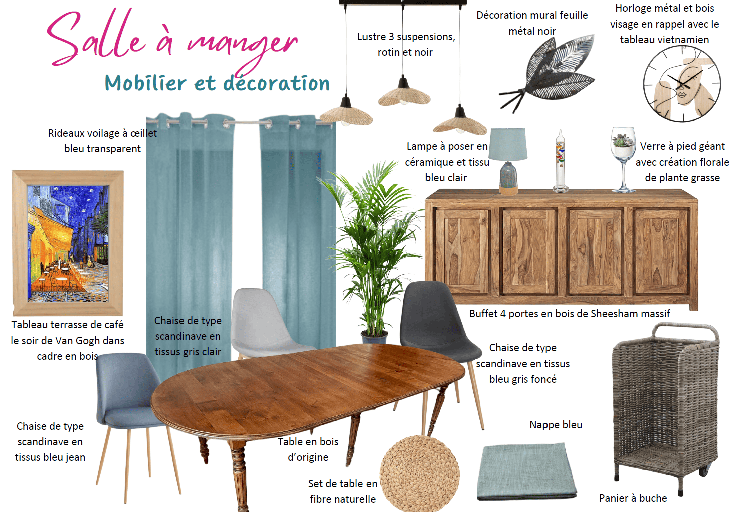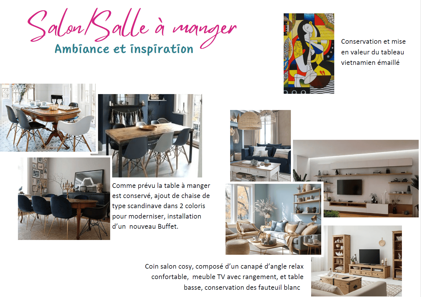 Lors de notre rencontre, nous avons défini ensemble les envies et besoins du client. J’ai ensuite travaillé une palette de bleus légèrement grisés, déclinés en camaïeu pour créer une atmosphère douce et équilibrée. J’y ai associé des matériaux naturels, principalement le bois, afin d’apporter chaleur, authenticité et confort. Enfin, j’ai présenté les visuels et suggestions de décoration pour que le client puisse se projeter facilement dans son futur salon.