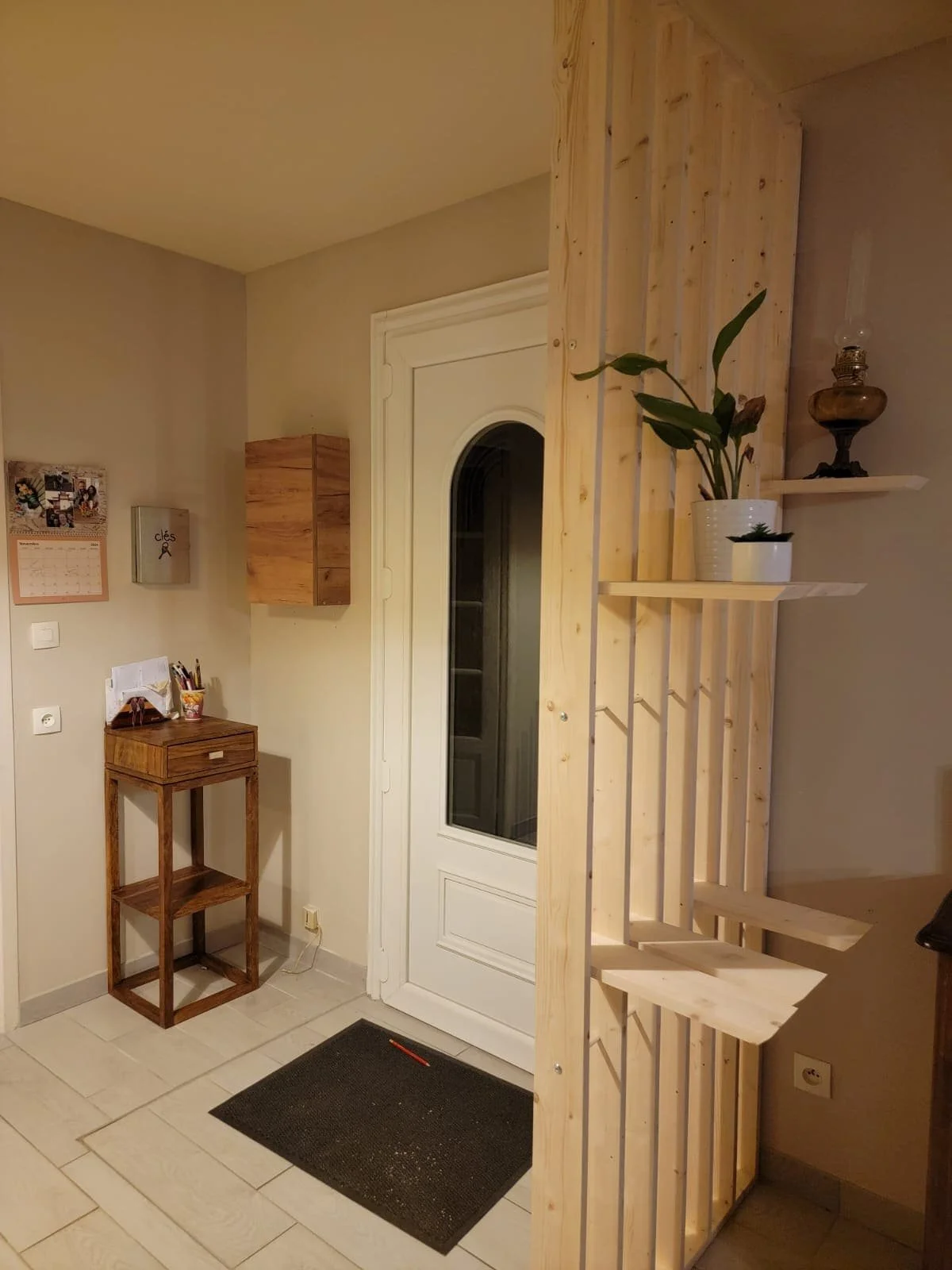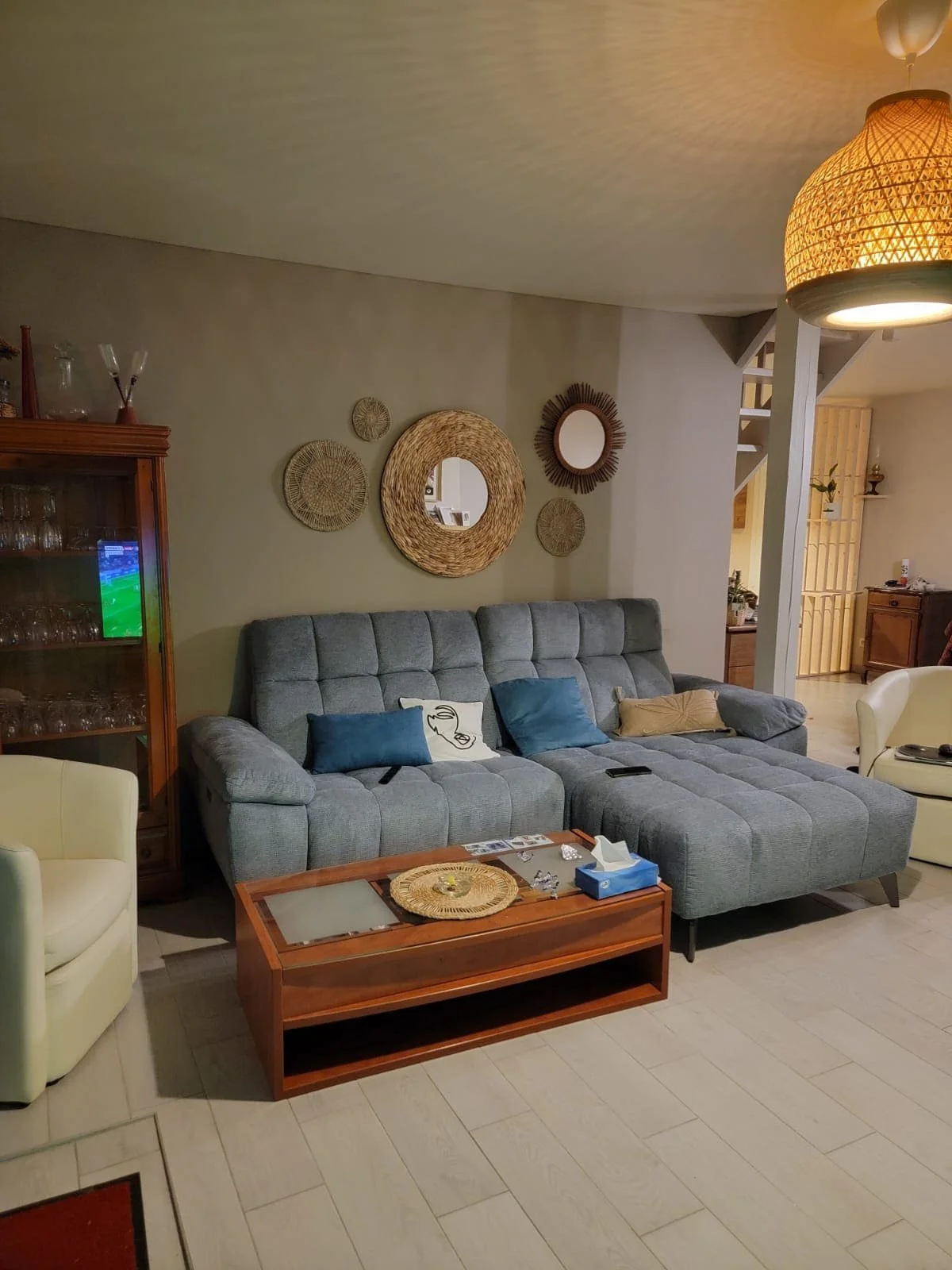 Le client a validé une ambiance qui lui ressemble, où les teintes bleutées rappellent la mer et les voyages tout en créant une sensation de légèreté. Le bois et les matières naturelles renforcent le côté cosy et accueillant. L’espace est désormais pensé comme un véritable cocon de bien-être.